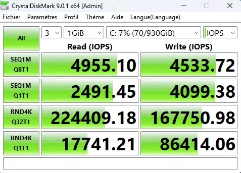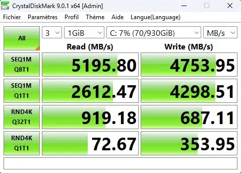 Le benchmark effectué avec CrystalDiskMark sur le disque donne de bons résultats, grâce à la présence du SSD Crucial P3 Plus, qui est une bonne référence.