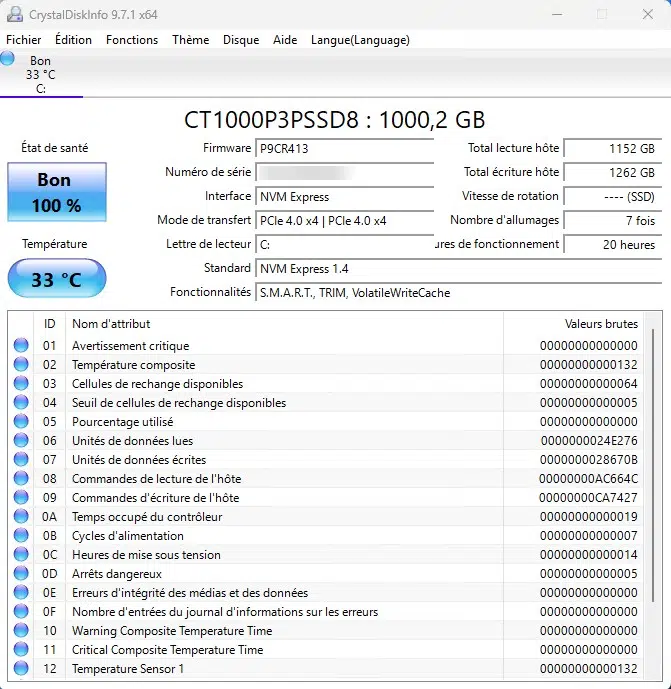 Voici une analyse CrystalDiskInfo du disque SSD NVMe présent dans ce PC :
