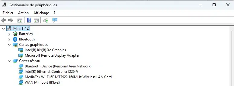 Ce mini PC est équipé d'une carte Wi-Fi avec la référence suivante : MediaTek MT7922, compatible Wi-Fi 6E. Tandis que la connectivité réseau filaire est assurée par une interface Intel I226-V.