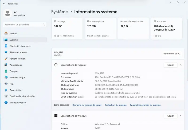 Commençons par découvrir les caractéristiques principales du Geekom IT12 2025 Edition, dans la version que j'ai eu l'opportunité de tester.