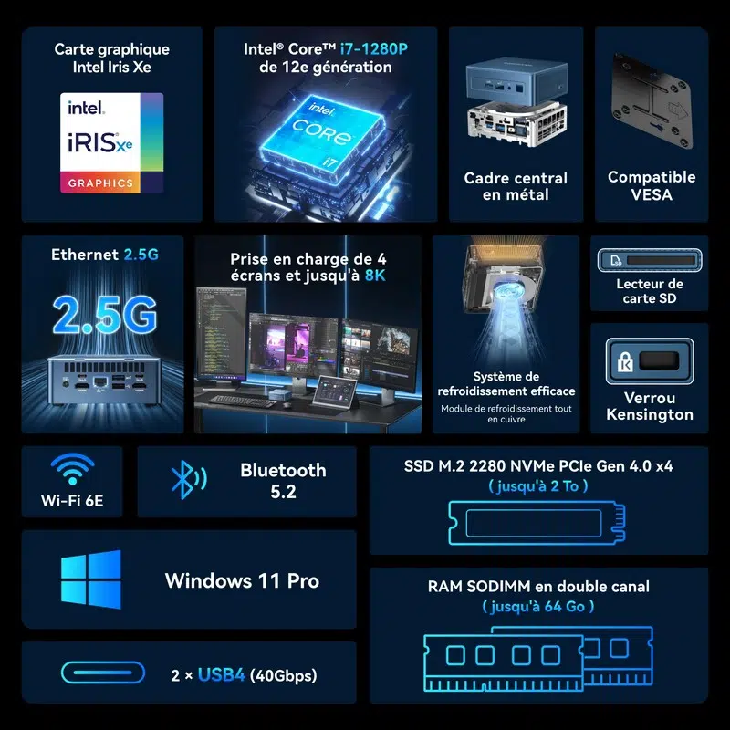 Ce Mini PC est capable de gérer jusqu’à quatre écrans simultanément, grâce à ses deux sorties HDMI et ses deux ports USB4. Les ports HDMI 2.0 permettent un affichage en 4K à 60 Hz, tandis que les ports USB4 offrent la possibilité de monter jusqu’en 8K à 30 Hz. De quoi envisager aussi bien une configuration bureautique multi-écrans qu’un poste orienté multimédia.