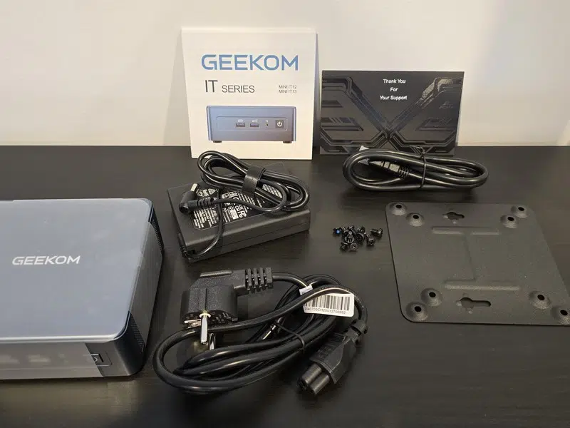 Au final, le bundle proposé par Geekom comprend : le Mini PC IT12 2025 Edition, un câble HDMI, une alimentation externe accompagnée de son câble, ainsi qu’une plaque de fixation VESA avec les vis nécessaires pour installer l’appareil à l’arrière d’un écran compatible. On trouve également une notice claire, qui détaille notamment la procédure pour ajouter un disque ou utiliser le support VESA, ainsi qu’une petite lettre de remerciement pour l’achat. Un kit complet, même si sans réelle surprise pour moi, car c'est le package habituel chez Geekom.