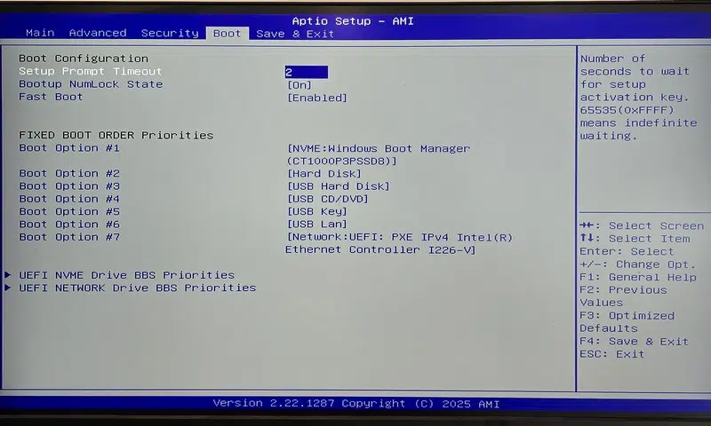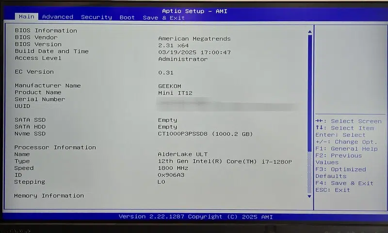 Mettons en route le Mini PC IT12 2025 Edition de Geekom ! Une fois les périphériques connectés, la première étape consiste à finaliser l’installation de Windows 11 Pro. Mais n'allons pas trop vite, intéressons-nous d’abord aux options disponibles dans le BIOS.