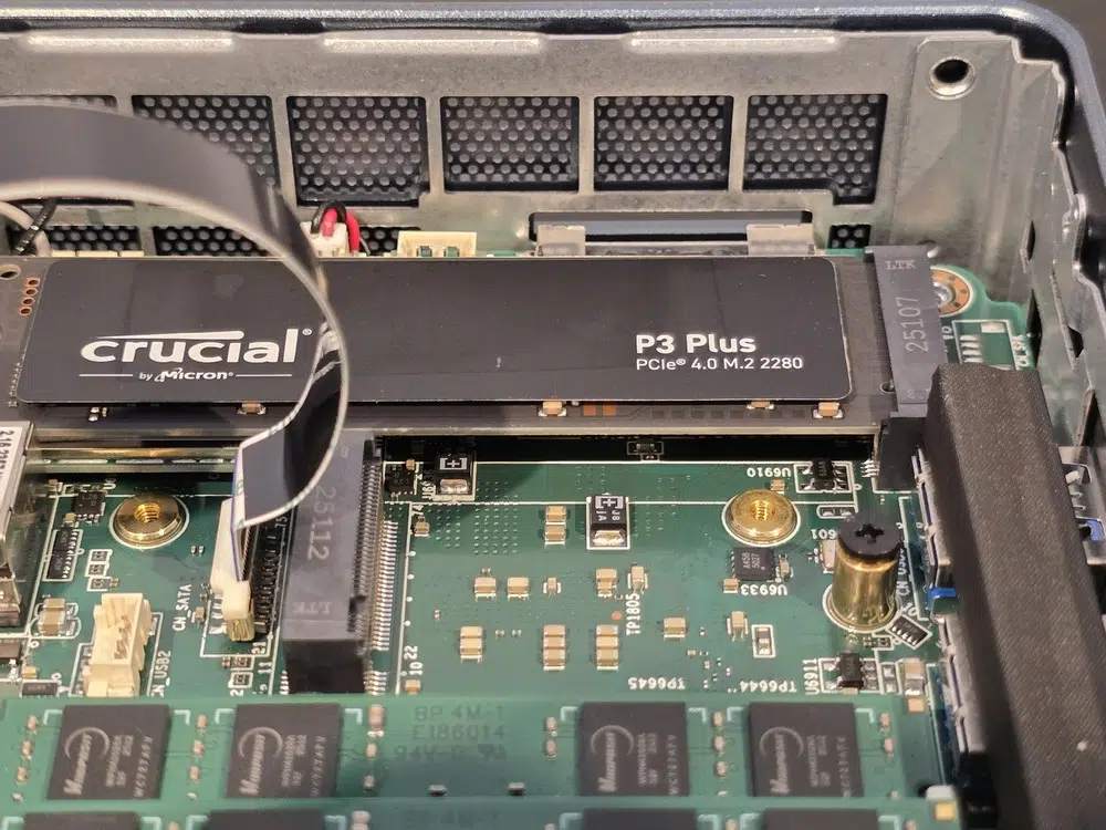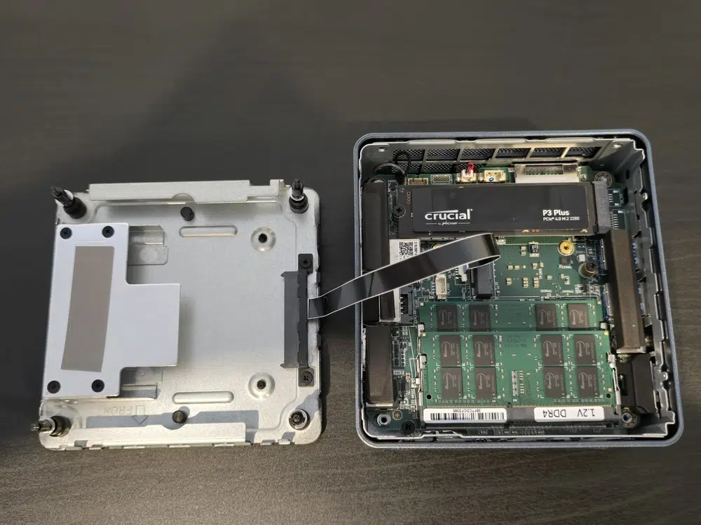 L’ajout d’un disque SATA au format 2,5 pouces se fait directement dans la cage métallique intégrée à la partie amovible du boîtier (visible à gauche sur la première photo ci-dessous). L’opération est simple et ne nécessite aucun adaptateur particulier. Par ailleurs, un emplacement supplémentaire est disponible entre le SSD NVMe déjà installé et les barrettes de mémoire RAM, permettant d’ajouter un second SSD au format M.2 SATA (au format 2242).