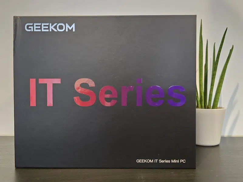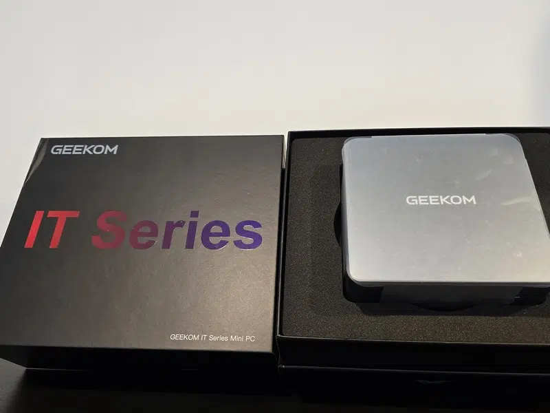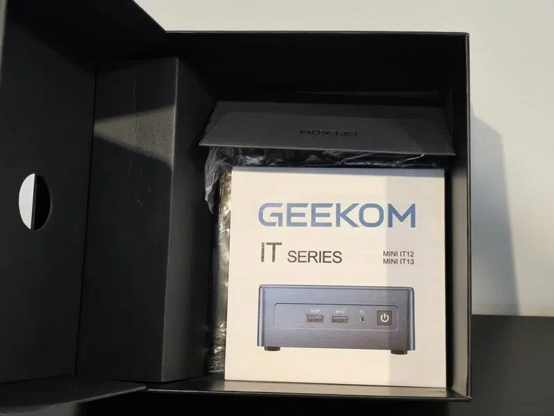 Il est temps de passer au déballage de ce Mini PC afin de découvrir son design et ses accessoires. L’emballage inspire confiance : la boîte est soignée et met en avant la série IT de chez Geekom. À l’intérieur, le Mini PC est solidement maintenu et parfaitement protégé par un bloc de mousse rigide. Juste en dessous, on retrouve l’ensemble des accessoires fournis par Geekom, dans un compartiment distinct.