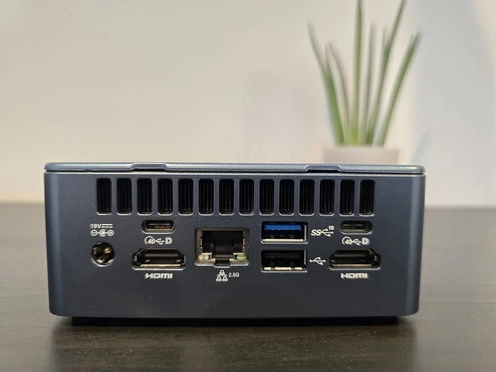 L’arrière concentre l’essentiel de la connectique, dont deux ports USB4 au format USB-C compatibles PowerDelivery, offrant un débit théorique pouvant atteindre 40 Gbps. Au total, le Mini PC dispose de 6 ports USB, dont un port USB 2.0 (assez inattendu en 2025), mais cela reste une connectique généreuse pour ce type de machine, où l’on trouve généralement seulement quatre ports. Le port USB 2.0 peut être pratique pour connecter un dongle USB pour un périphérique sans-fil, par exemple.