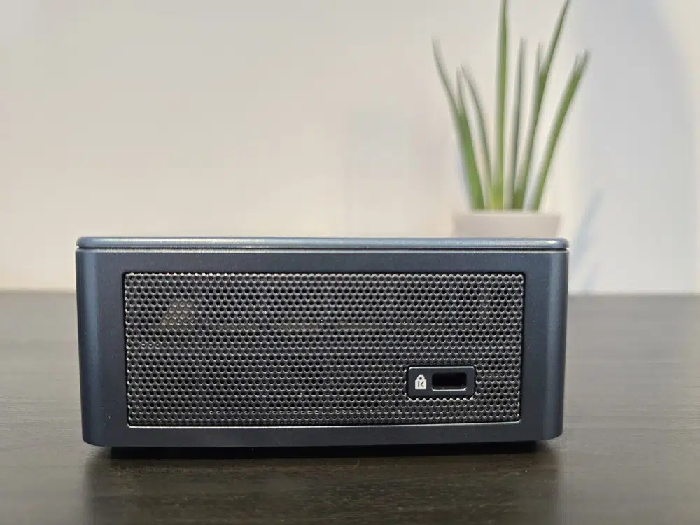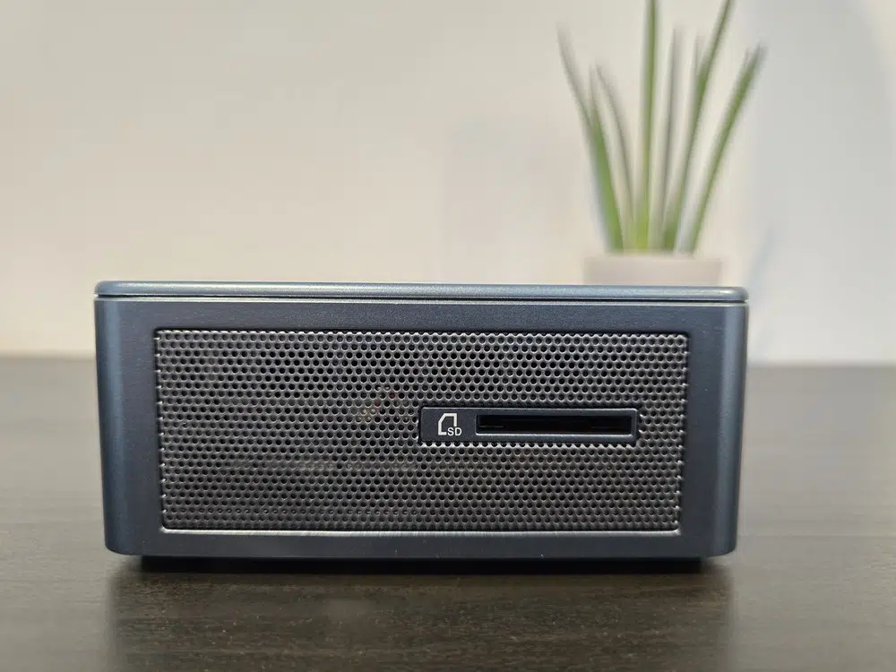 Sur la façade avant, on retrouve deux ports USB : un USB 3.2 Gen2 avec PowerDelivery (PD) et un USB 3.2 Gen2 standard, accompagnés d’une prise casque et du bouton d’alimentation. Le côté droit accueille une fente de sécurité Kensington, tandis que le côté gauche intègre un lecteur de carte SD.