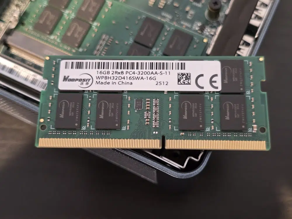 - Deux barrettes de RAM de marque Wooposit : 16 Go Rx8 - PC4-3200AA-S-11. Soit 32 Go au total. Il est possible de passer sur 64 Go de RAM, mais ceci implique de remplacer les deux barrettes déjà présentes, car les deux slots sont occupés. Cette marque est régulièrement utilisée par Geekom pour équiper ses mini PC.