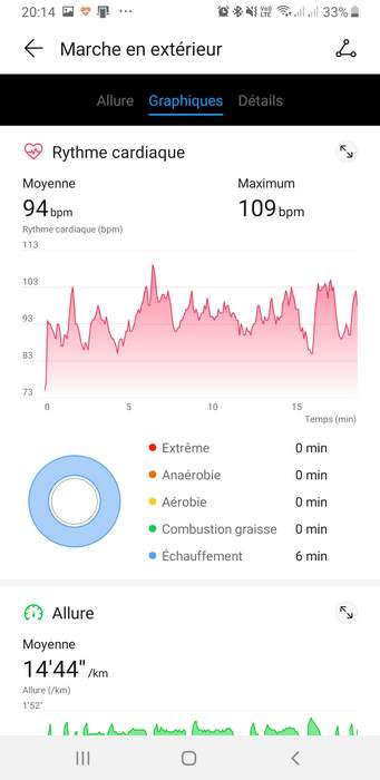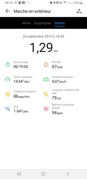 C'est le moment de parler un peu plus des activités sportives. Déjà, il est à noter qu'en raison de l'absence d'une puce GPS et malgré une connectivité Bluetooth sur le smartphone, il n'est pas possible d'avoir le tracé GPS de votre parcours. A moins de lancer l'activité directement depuis le smartphone, et là le GPS sera activé de cette manière (merci à @Florent pour l'info). L'application Huawei collecte pas mal d'informations, avec notamment un bon suivi niveau cardiaque, ce qui nous donne, par exemple :