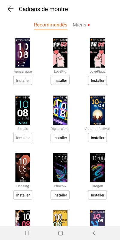 Enfin, le bracelet intègre quelques faces pour personnaliser l'affichage de l'écran. Au niveau de l'application, on retrouve un catalogue où l'on peut en récupérer gratuitement.