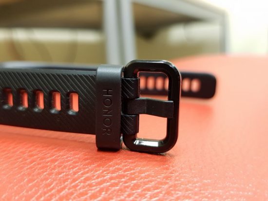 Le bracelet en silicone propose un système d'attache comme sur une montre classique, avec un nombre de crans important. Une fois bien serré, le bracelet tient bien en place. Le système de fermeture avec crochet est également en plastique. Le défaut du silicone c'est que c'est une matière salissante, avec notamment la poussière qui vient se coller dessus : ce bracelet ne déroge pas à la règle.