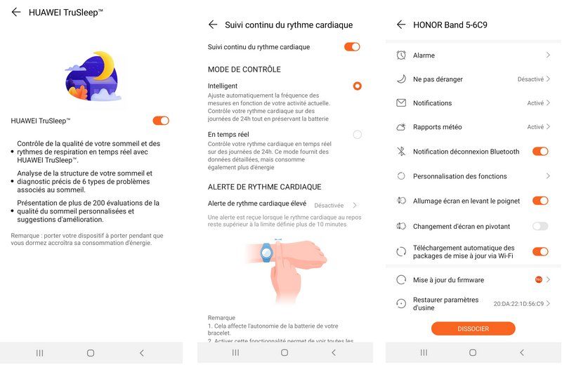 Pour le bracelet Honor Band 5, l'application Huawei offre les fonctionnalités suivantes :