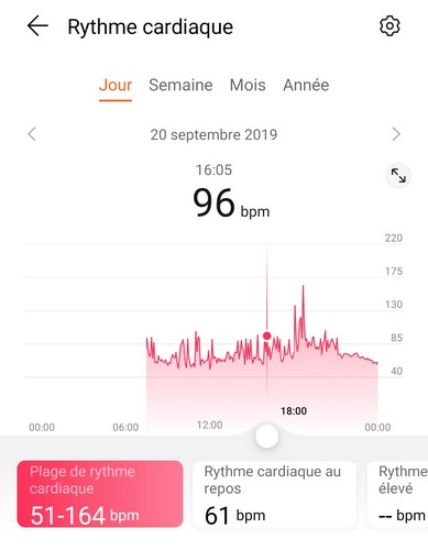 Voici un exemple de graphe que l'on peut obtenir lorsque l'on active l'analyse de la fréquence cardiaque sur une journée complète. Vous remarquerez le pic en fin de journée correspondant à ma séance de sport ?