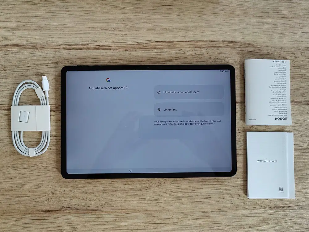 La tablette est livrée dans une boite au design soigné, et permettant d'avoir un aperçu sur le design du produit. À l'intérieur de la boite, Honor a glissé la tablette, un câble USB-C et un guide de démarrage rapide. Comme pour les smartphones, faisons une croix sur le chargeur mural, même si l'on m'a fourni un chargeur non officiel, dans le cadre de ce test.