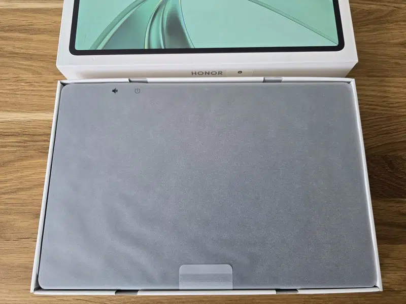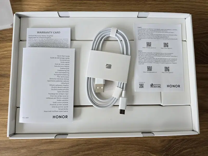 Fidèle à sa réputation, HONOR a préparé un packaging soigné pour sa tablette. En plus de l'appareil en lui-même, la boite contient un câble USB-A vers USB-C pour recharger la tablette, ainsi qu'un outil pour extraire le slot permettant d'insérer une carte SIM. Sans surprise, le chargeur mural n'est pas inclus de base avec la tablette. Néanmoins, dans le cadre de ce test, on m'a fourni un chargeur non officiel, ainsi qu'un stylet (vendu en option).