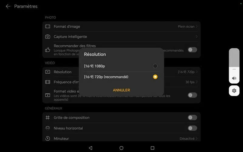 L'application caméra intègre plusieurs modes de prise de vue (photo, vidéo, portrait, scanner le document, etc.), ainsi que des filtres. Pour les vidéos, vous pouvez filmer en HD ou Full HD selon vos besoins, avec une fréquence d'images limitée à 30 fps en Full HD.