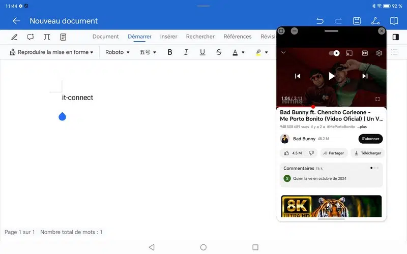 Remarque : vous pouvez afficher 2 applications côte à côte, ainsi qu'une 3ème application dans une fenêtre flottante. De plus, un autre mode permet d'afficher la même application sur 2 fenêtres différentes.