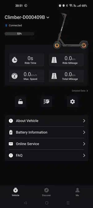 Disponible sur iOS et Android, l'application officielle INMOTION permet de se connecter à sa trottinette électrique à distance via Bluetooth (donc à une distance raisonnable). Une fois la Climber associée au compte de l'utilisateur via l'application, elle offre un ensemble de fonctionnalités :