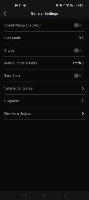 - Réglages du mode : mode D ou mode S (bridé ou pas), métrique, mise à jour firmware et gestion du zero-start