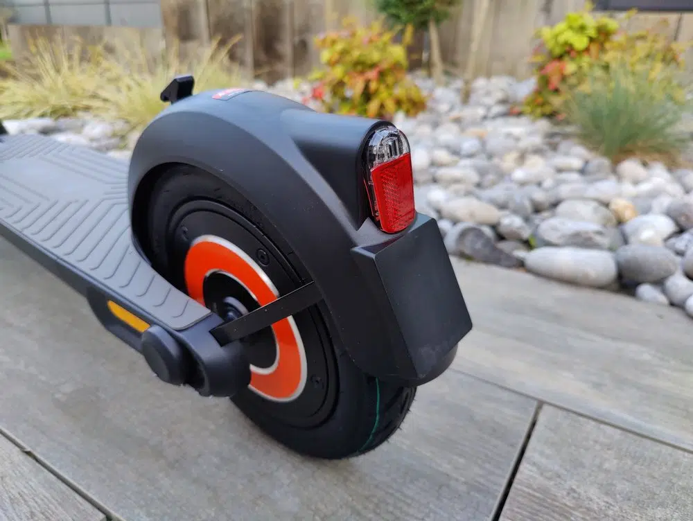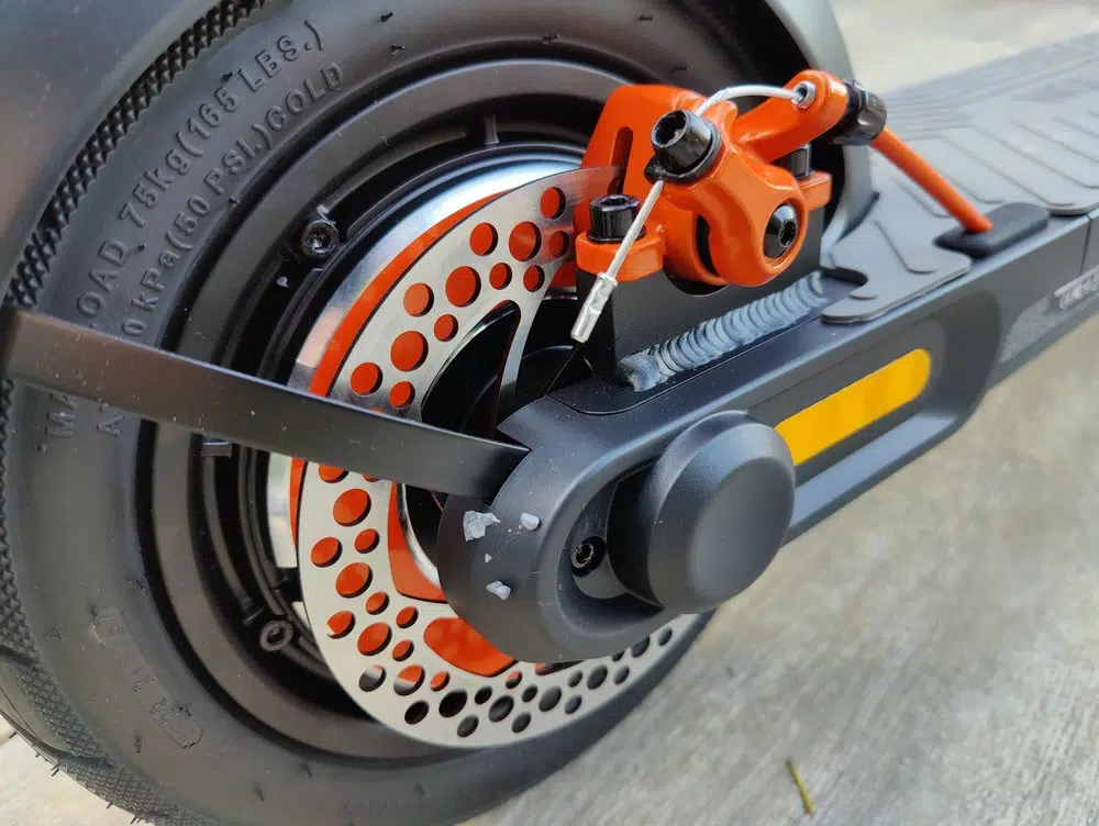Le freinage est électrique sur les deux roues, et la roue arrière bénéficie en plus d'un frein à disque imposant vis-à-vis de la taille de la roue : un système de freinage rassurant. D'ailleurs, je peux vous assurer que la trottinette freine très bien. La sécurité du pilote étant importante, c'est un point à souligner.