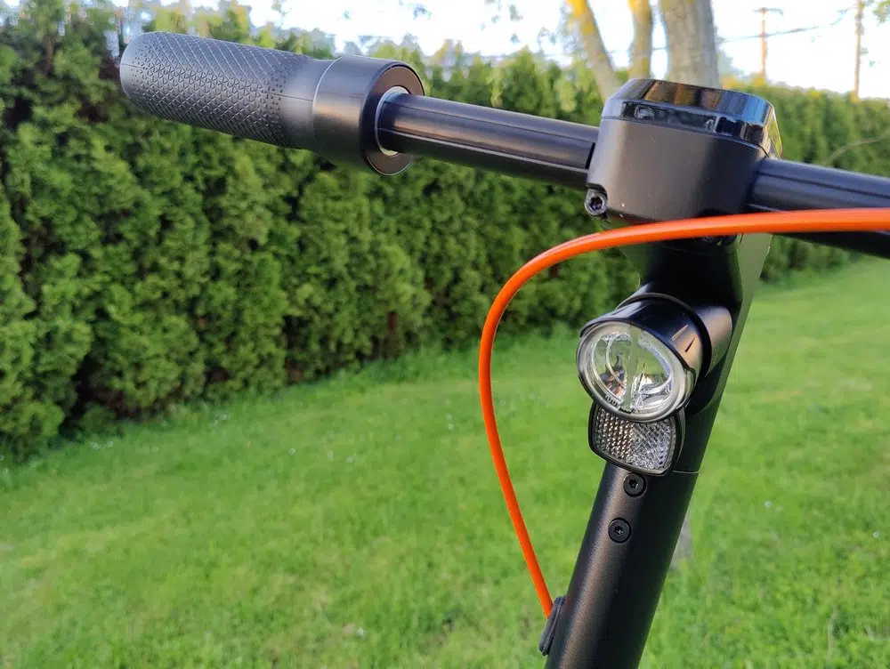 Positionné au centre du guidon et parfaitement intégré, l'écran de la trottinette indique la vitesse actuelle, le mode actuel (D/S), ainsi que l'état de la connectivité Bluetooth et le niveau de batterie restant. C'est aussi à cet endroit que l'on trouve le seul et unique bouton. Grâce à une pression longue, on peut allumer ou arrêter la trottinette, tandis qu'une pression brève permet d'allumer ou d'éteindre l'éclairage. En plus de l'écran, le guidon de la trottinette est équipé d'une sonnette, positionnée discrètement à côté de la poignée gauche.