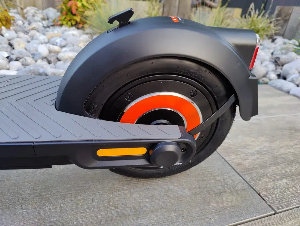 De manière générale, la trottinette Climber hérite de belles finitions et la qualité de fabrication est bonne. Entièrement peinte en noire, la trottinette a un vrai style grâce aux éléments en orange, comme la gaine pour le freinage, l'actionneur pour le frein à disque et les jantes des roues.