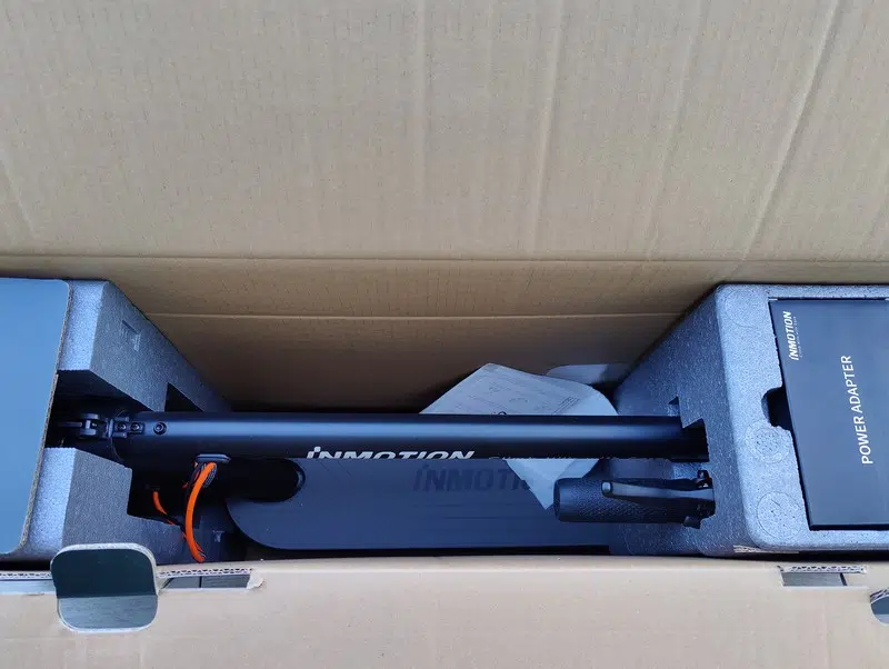 L'InMotion Climber est livrée dans un carton imposant, lui-même emballé dans du plastique. Ce qui n'a pas empêché mon colis d'avoir un choc, mais heureusement, le matos à l'intérieur du carton est correctement protégé avec du polystyrène moulé. Aucune conséquence pour le matériel ! La trottinette est repliée sur elle-même et il faudra assembler certains éléments. À cela s'ajoutent deux boites d'accessoires.