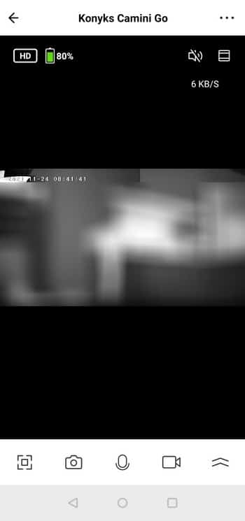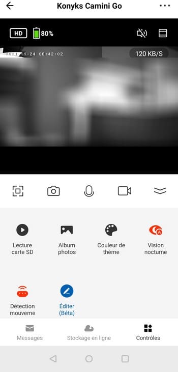 L'application Konyks sert à piloter la caméra, à effectuer la configuration et à accéder aux enregistrements. Lorsque l'on accède à la caméra, on voit l'image en direct : on peut zoomer et passer en mode plein écran, ainsi que d'autres infos comme l'autonomie restante. Ensuite, il y a des boutons d'action un peu partout répartis sur l'écran. Voici quelques actions possibles :