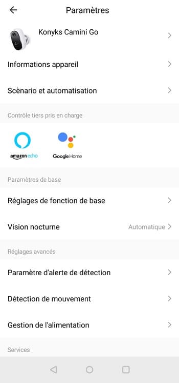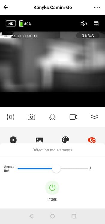 Concernant la détection, une notification sera envoyée, accompagnée d'une photo, lorsqu'un mouvement sera détecté. À ce niveau, je trouve que la caméra de Konyks est réactive, aussi bien avec les humains que les animaux. Si vous trouvez que la caméra n'est pas assez sensible, il est possible de gérer la sensibilité via les options (voir les copies d'écran ci-dessus). Ce qui manque, c'est de ne pas pouvoir créer une zone d'exclusion pour la détection. Cette fonction est bien pratique lorsque la caméra a dans son objectif une zone que vous ne souhaitez pas surveiller (exemple : la voie publique).