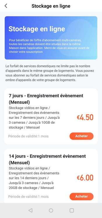 Si vous préférez miser sur le stockage Cloud plutôt que le stockage local afin d'externaliser les enregistrements, il faudra passer à la caisse. La première offre d'abonnement est à 4,50 euros par mois pour un historique de 7 jours et jusqu'à 3 caméras. Pour un historique sur 30 jours, il faudra compter 9 euros par mois (et vous pouvez inclure jusqu'à 5 caméras). C'est dommage qu'il ne soit pas possible d'envoyer les enregistrements sur un serveur FTP, pour ceux qui ont un NAS à la maison, ça pourrait être cool.