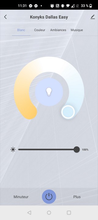 Tout d'abord, il y a un onglet "Blanc" qui permet d'allumer le bandeau LED en réglant la température du blanc : lumière chaude ou lumière froide, à vous de choisir. Cela s'effectue très facilement à l'aide d'un curseur pour régler la température de blanc, ainsi qu'un autre curseur pour régler l'intensité lumineuse.