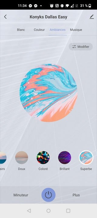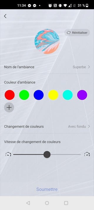 Ensuite, nous avons l'onglet "Ambiances" : il y a 8 ambiances prédéfinies que vous pouvez utiliser. Certaines comme l'ambiance "Superbe" contiennent plusieurs couleurs, ce qui signifie que la couleur va changer dynamiquement. En modifiant une ambiance, on peut gérer la vitesse de transition, mais aussi modifier les couleurs. Vous pouvez modifier les 8 ambiances par défaut comme bon vous semble, y compris pour changer le nom.