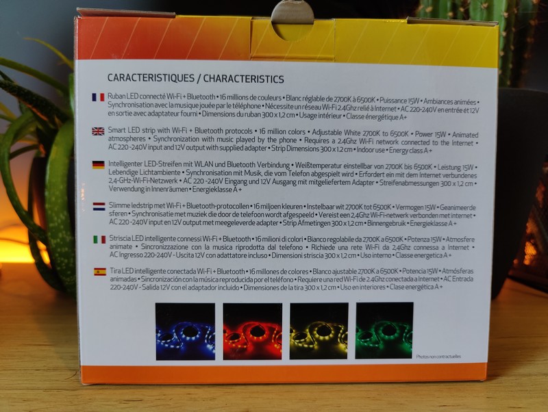 La boite nous donne de nombreuses informations sur le produit et un aperçu sur le visuel. D'ailleurs, toutes les caractéristiques citées ci-dessus sont marquées à l'arrière de la boîte, ce qui est appréciable. Sachez que ce ruban LED a une durée de vie estimée à 20 000 heures de fonctionnement.