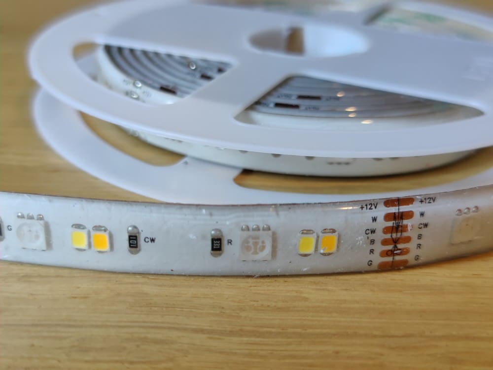 Sur le bandeau LED, nous retrouvons plusieurs types de LEDs : certaines sont là pour l'éclairage en couleurs, et d'autres pour les différentes températures de blanc. Tous les 10 ou 20 cm, on peut retrouver un marquage pour couper le bandeau LED s'il est un peu trop long (cette action est définitive).