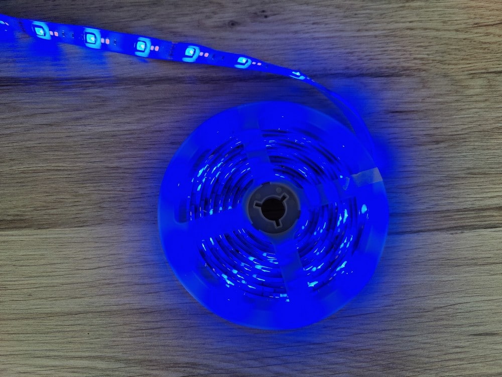 C'est bien tout ça, mais il ressemble à quoi le bandeau LED quand il est allumé ? Voici un premier exemple avec le même bleu, mais avec une intensité différente. De gauche à droite : intensité minimale (1), intensité moyenne (50) et intensité maximale (100).