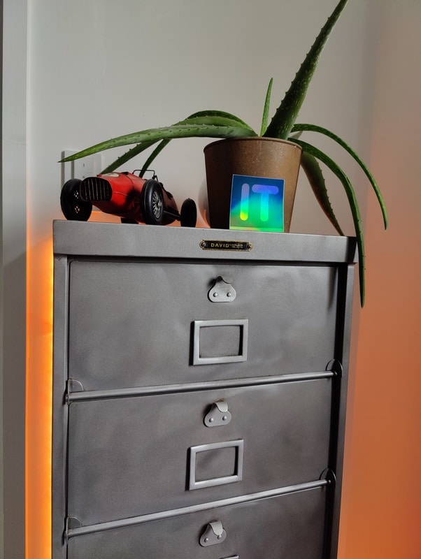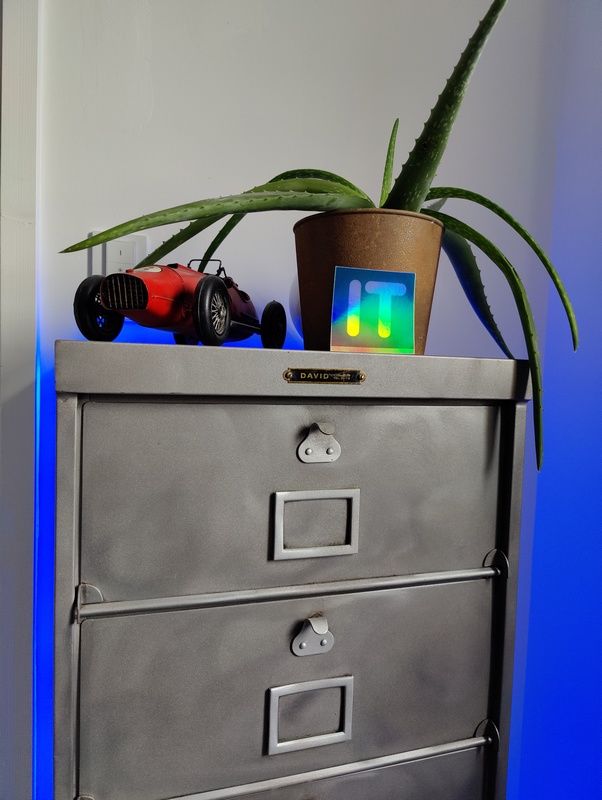 Lorsqu'un bandeau LED est installé derrière un meuble, cela donne toujours un effet sympa ! C'est le cas avec ce modèle où la lumière est bien régulière. À voir dans le temps si l'adhésif tient bien sur le meuble, ce dernier étant en métal.