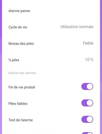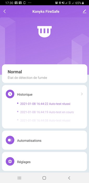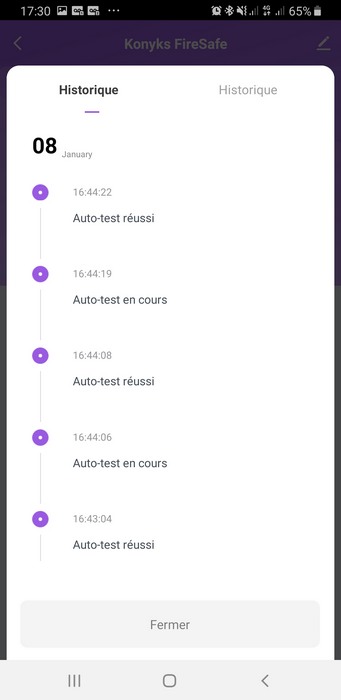 Après avoir ajouté le détecteur de fumée au sein de l'application, on peut accéder à l'appareil. L'application indique son état et donne accès à l'historique des événements (voir ci-dessous) : on retrouve l'historique des tests et des alarmes.