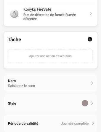 Le menu "Automatisations" va permettre de créer des actions automatiques. Par exemple, s'il y a de la fumée détectée : allumer toutes les lumières de la maison et ouvrir tous les volets.
