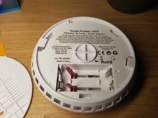 La qualité de fabrication est bonne, le plastique n'a pas de bavure et le détecteur est correctement assemblé. Sans surprise le détecteur de fumée est entièrement blanc : idéal puisqu'il est destiné à être fixé au plafond. Après avoir retiré l'arrière du détecter de fumée, on accède au compartiment afin d'insérer les deux piles fournies.