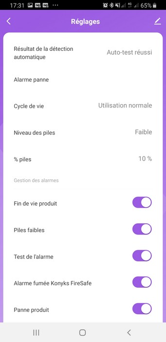 Après avoir ajouté le détecteur de fumée au sein de l'application, on peut accéder à l'appareil. L'application indique son état et donne accès à l'historique des événements (voir ci-dessous) : on retrouve l'historique des tests et des alarmes.