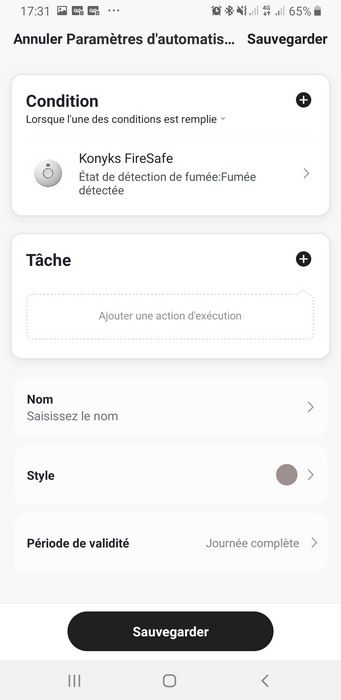 Le menu "Automatisations" va permettre de créer des actions automatiques. Par exemple, s'il y a de la fumée détectée : allumer toutes les lumières de la maison et ouvrir tous les volets.