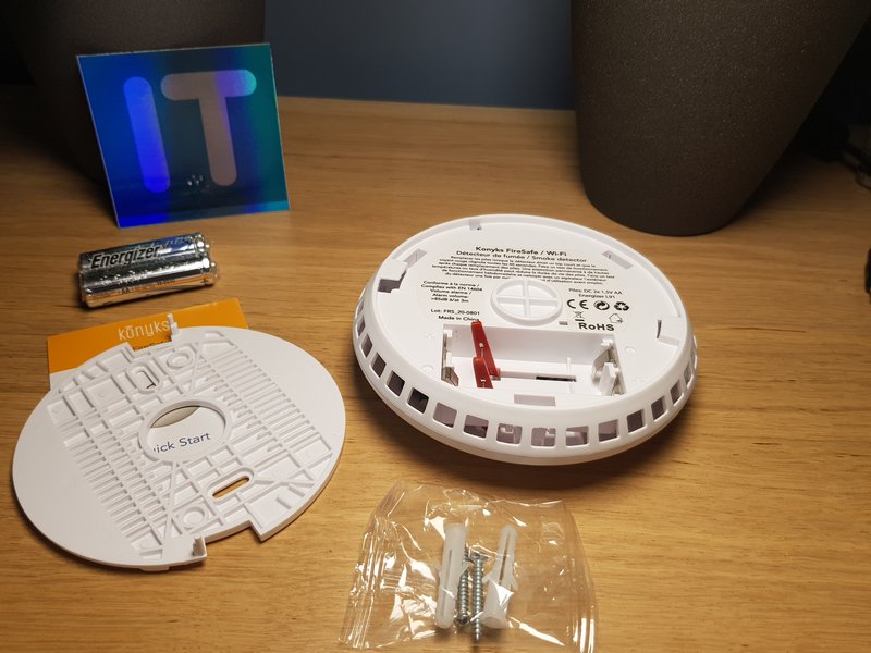 A l'intérieur de l'habituelle boîte aux couleurs Konyks, nous retrouvons plusieurs éléments : un guide rapide qui renvoie vers le site Internet de Konyks, des piles Energizer, un kit de montage (deux chevilles et deux vis) et bien sûr le détecteur de fumée.