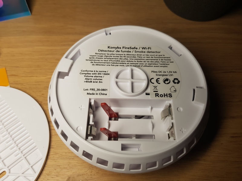 La qualité de fabrication est bonne, le plastique n'a pas de bavure et le détecteur est correctement assemblé. Sans surprise le détecteur de fumée est entièrement blanc : idéal puisqu'il est destiné à être fixé au plafond. Après avoir retiré l'arrière du détecter de fumée, on accède au compartiment afin d'insérer les deux piles fournies.