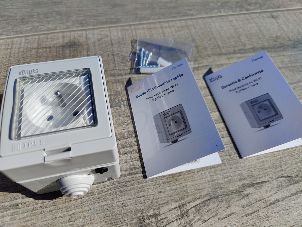 Comme à son habitude, Konyks propose un packaging bien présenté où l'on peut apercevoir l'appareil en photo, mais aussi en savoir plus sur ses caractéristiques techniques. À l'intérieur, nous retrouvons la prise connectée, un kit de visserie, la note de garantie et de conformité, et le guide d'installation rapide.