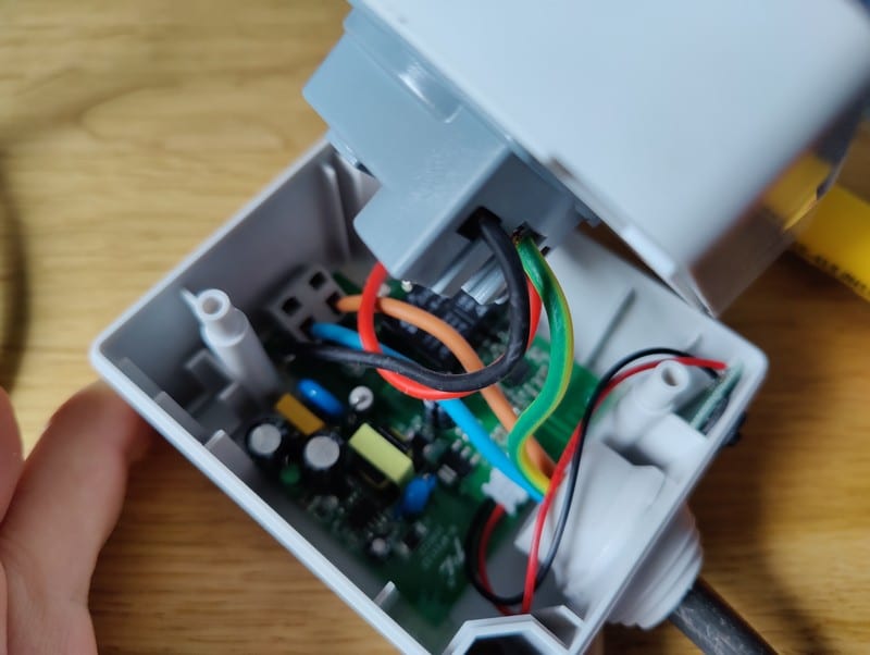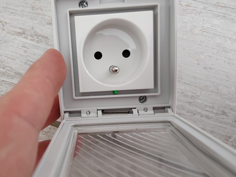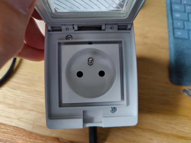 Lorsque le raccordement est fait, il faut fermer le boîtier de la prise connectée. Pour qu'il soit bien fermé et hermétique, il y a deux visse à mettre. Pour cela, il faut soulever le capot qui protège la prise de courant : vous trouverez deux trous pour visser et verrouiller le boîtier. À aucun moment ce n’est précisé sur la notice, il faut chercher par soi-même !
