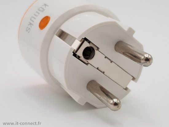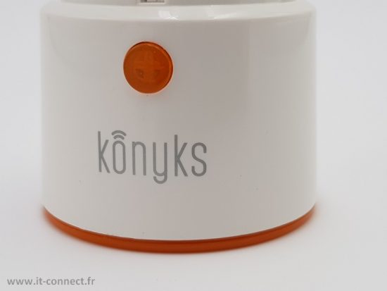 Le fait qu'elle soit compacte rend la prise plus jolie, entièrement blanche, elle a tout de même un bouton de couleur orange et un anneau orange sur l'extrémité. Une couleur orange qui est reprise sur l'intérieur de la prise. Sur le dessus, la mention Konyks est inscrite en gris argenté.