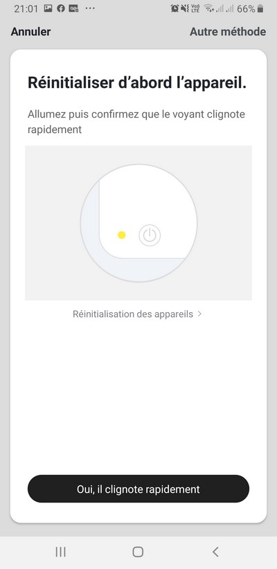 Comme expliqué dans la notice d'utilisation, pour initialiser l'appareil, il faut le brancher et rester appuyé 10 secondes sur le bouton jusqu'à ce que le voyant clignote rapidement.