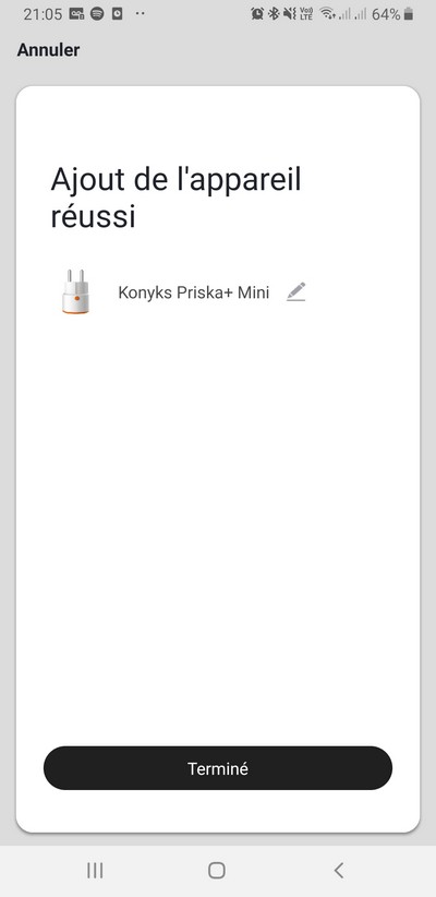 Il suffit ensuite d'ajouter un nouvel appareil dans l'application Konyks, de choisir la prise connectée, d'indiquer le réseau Wi-Fi, puis l'application va scanner l'environnement pour rechercher la prise Priska. Une fois associée à votre compte, vous avez la possibilité de changer son nom, et ensuite, c'est parti !