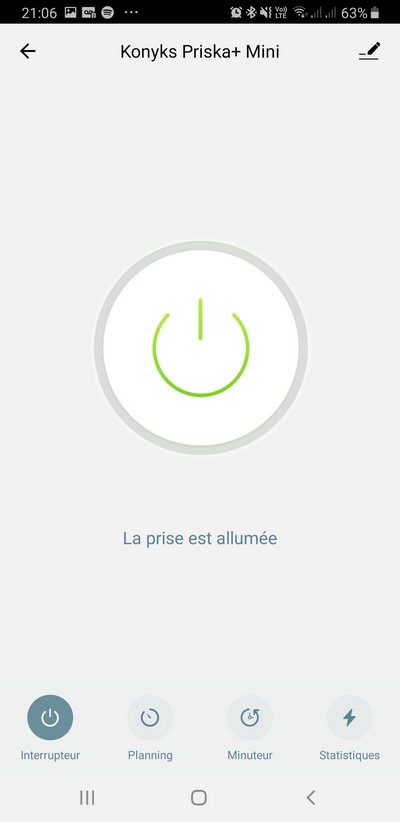 Dans l'application Konyks, lorsque l'on appuie sur la prise on accède à son panneau de contrôle. Un bouton central permet d'allumer ou d'éteindre d'une simple pression, et trois autres boutons dans le bas donnent accès aux fonctionnalités supplémentaires :