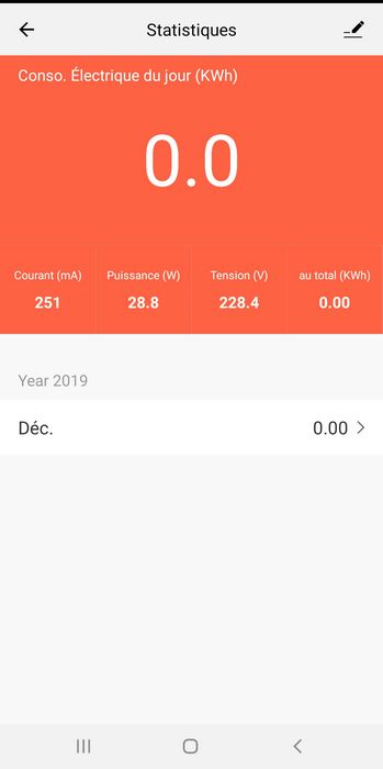 Au niveau de la consommation électrique, l'application permet d'accéder à l'historique sur 30 jours, dommage que ce ne soit pas plus. Au moins sur 1 an, par exemple, ce serait plus significatif. Par ailleurs, l'application Konyks affiche la consommation en temps réel sur la prise, avec plusieurs métriques : Courant (mA), Puissance (W), Tension (V), et la consommation (KWh).